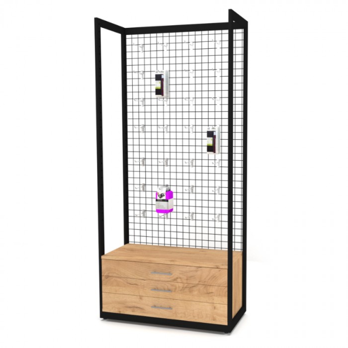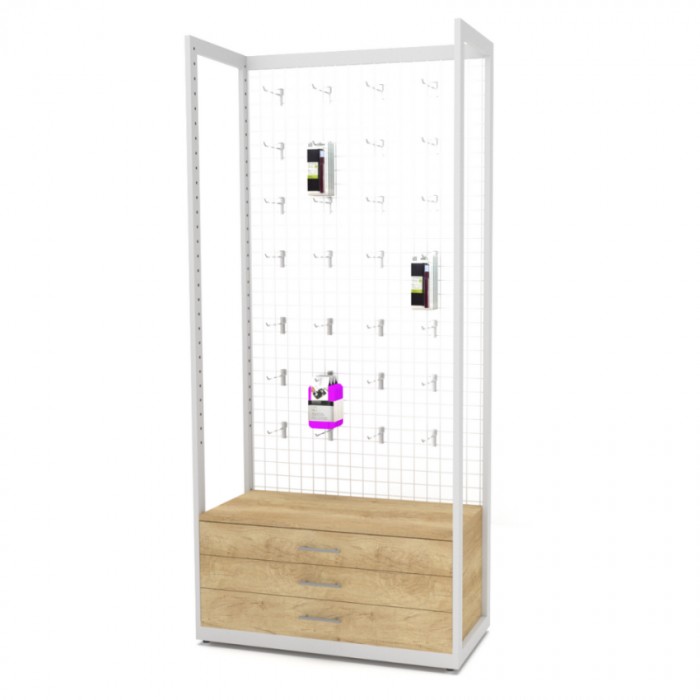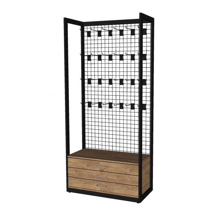 Έπιπλο Τοίχου με πλάτη από πλέγμα καρέ για τοποθέτηση γάντζων και συρτάρια στο κάτω μέρος.