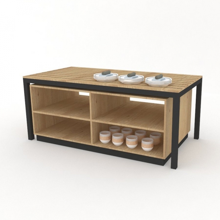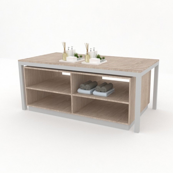 Τραπέζι προβολής προϊόντων στον κεντρικό χώρο του καταστήματος. Στο κάτω μέρος διαθέτει συμπληρωματικό έπιπλο με ράφια ανοιχτά σε δύο πλευρές.