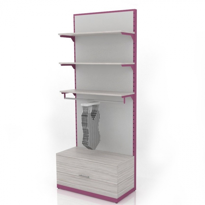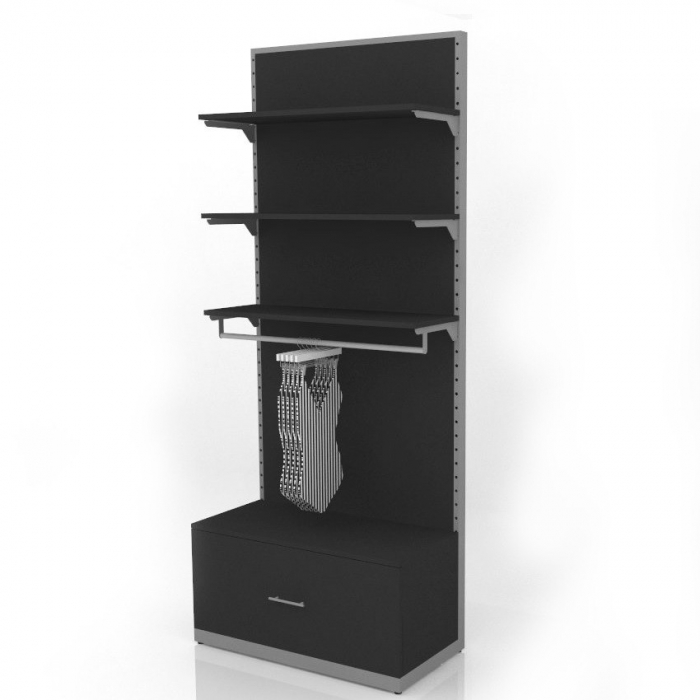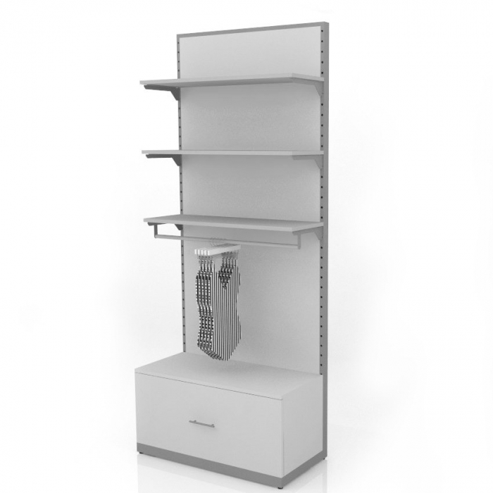 Έπιπλο Τοίχου - Ραφιέρα με διάτρητο μεταλλικό σκελετό για τη στήριξη και ρύθμιση ραφιών. Διαθέτει τρία (3) ρυθμιζόμενα ράφια μελαμίνης και ερμάριο με ένα (1) συρτάρι στη βάση του.