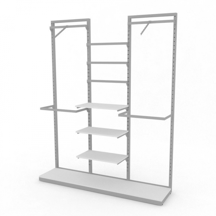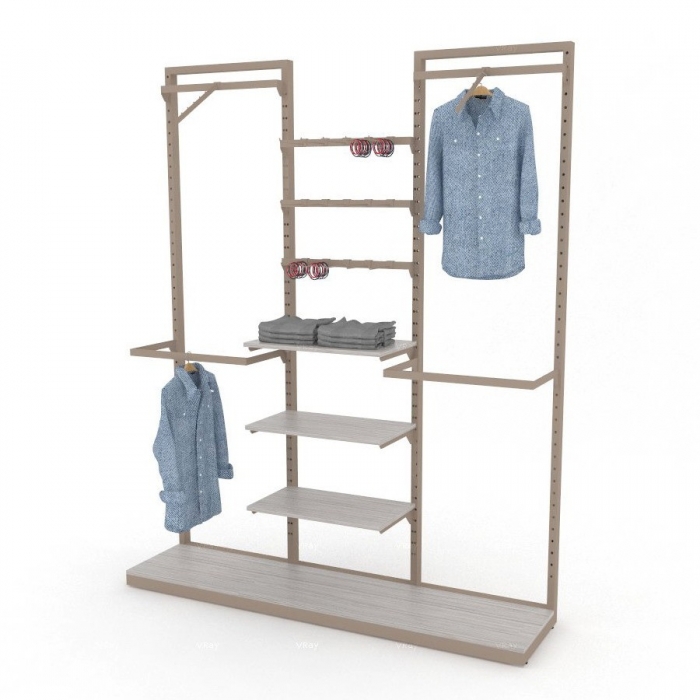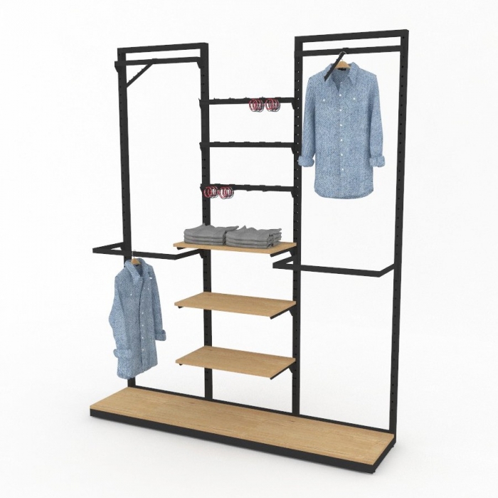 Επίτοιχη μονάδα με οριζόντιες και ανφάς μπάρες κρέμασης ενδυμάτων καθώς και ρυθμιζόμενα ράφια μελαμίνης για επιπλέον προβολή αξεσουάρ μόδας.
