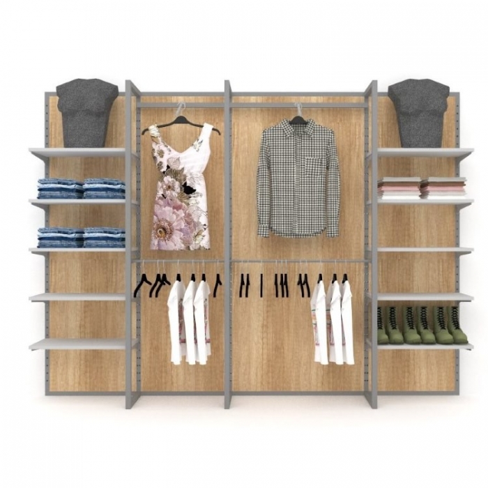 Αυτοστήρικτη σύνθεση τοίχου με διάτρητο μεταλλικό σκελετό για στήριξη και ρύθμιση ραφιών και μπάρες κρέμασης ενδυμάτων.