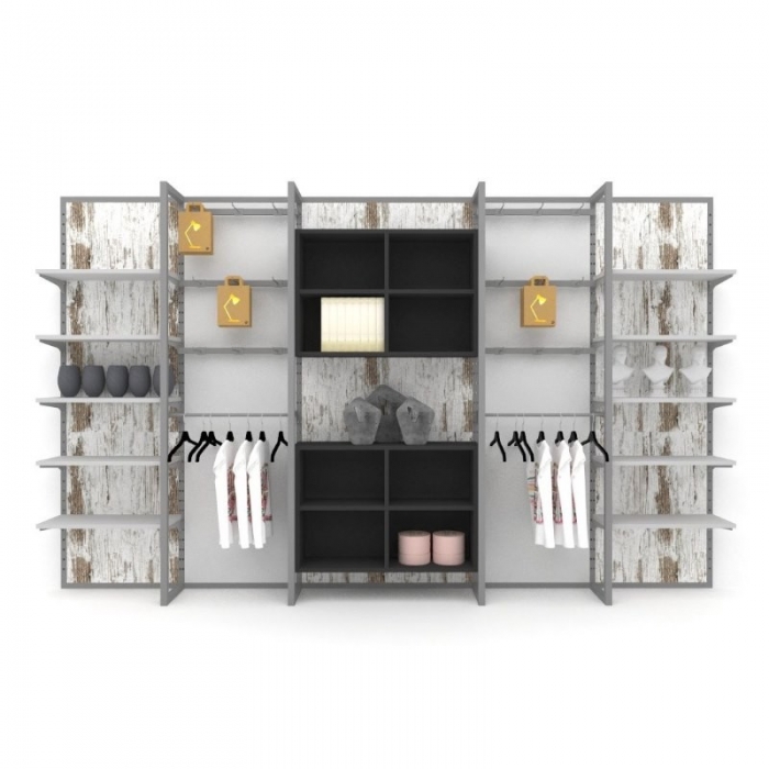 Stand Τοίχου αυτοστήρικτο με μεταλλικό σκελετό που διαθέτει διάτρητα κάθετα για στήριξη και ρύθμιση των εξαρτημάτων προβολής. Περιλαμβάνεις ράφια, κύβους και μπάρες για γάντζους και κρέμαση.