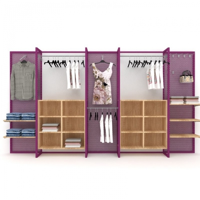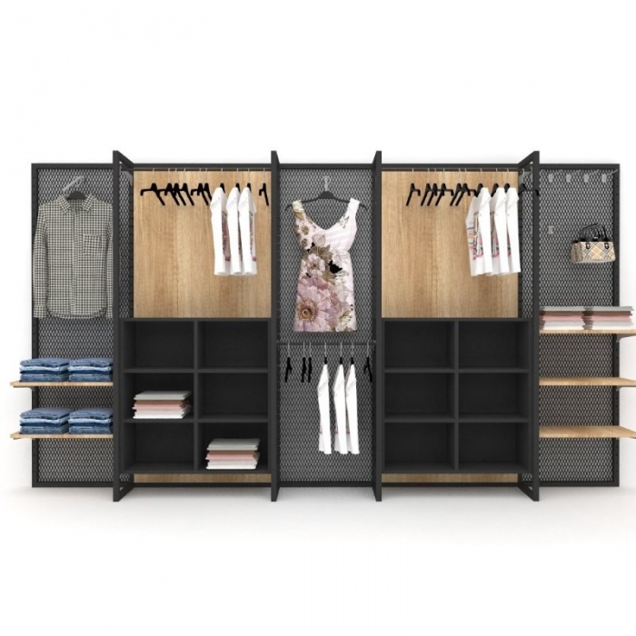 Αυτοστήρικτο Stand τοίχου με μεταλλικό πλέγμα και διατρήσεις στις οποίες στηρίζονται και ρυθμίζονται ράφια, μπάρες κρέμασης και ανοιχτές ραφιέρες μελαμίνης.