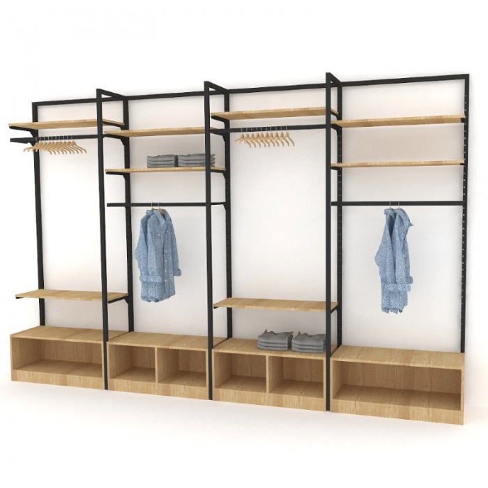 Αυτοστήρικτο Stand Ενδυμάτων για τοίχο. Διαθέτει τέσσερα "ανοίγματα", όπου στο καθένα προσαρμόζονται και ρυθμίζονται ελεύθερα εξαρτήματα όπως μπάρες κρέμασης ή στηρίγματα ραφιών.