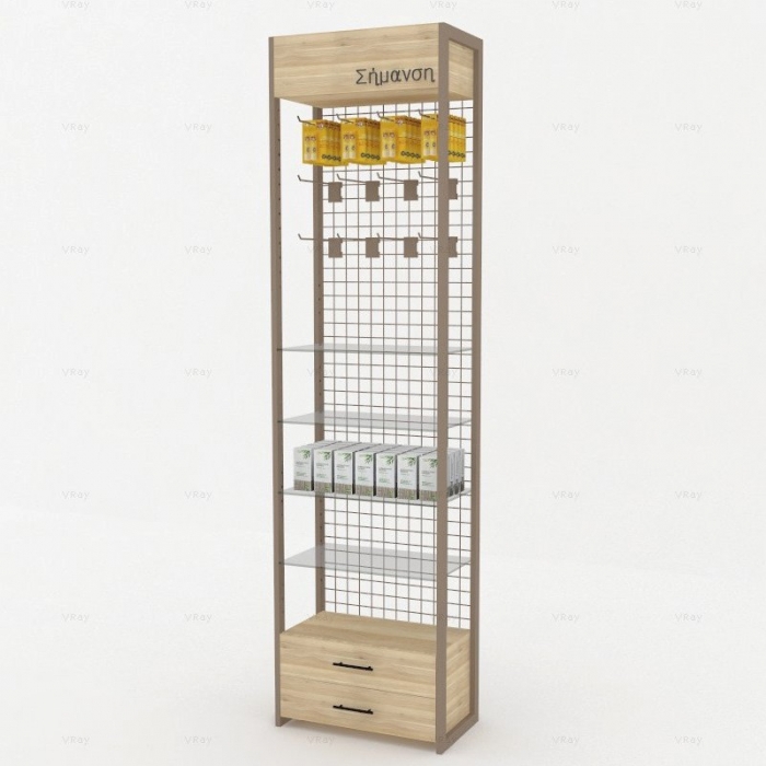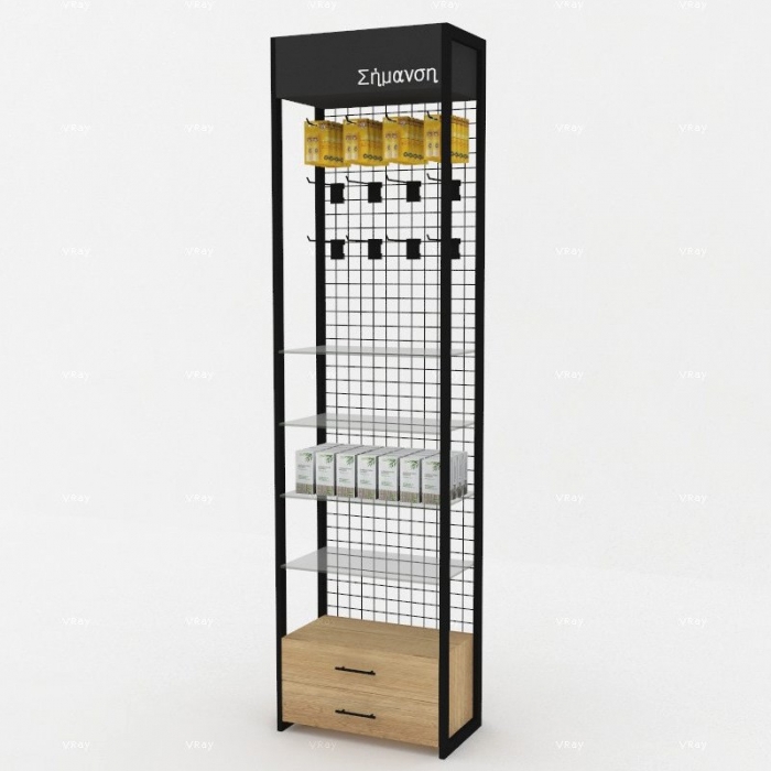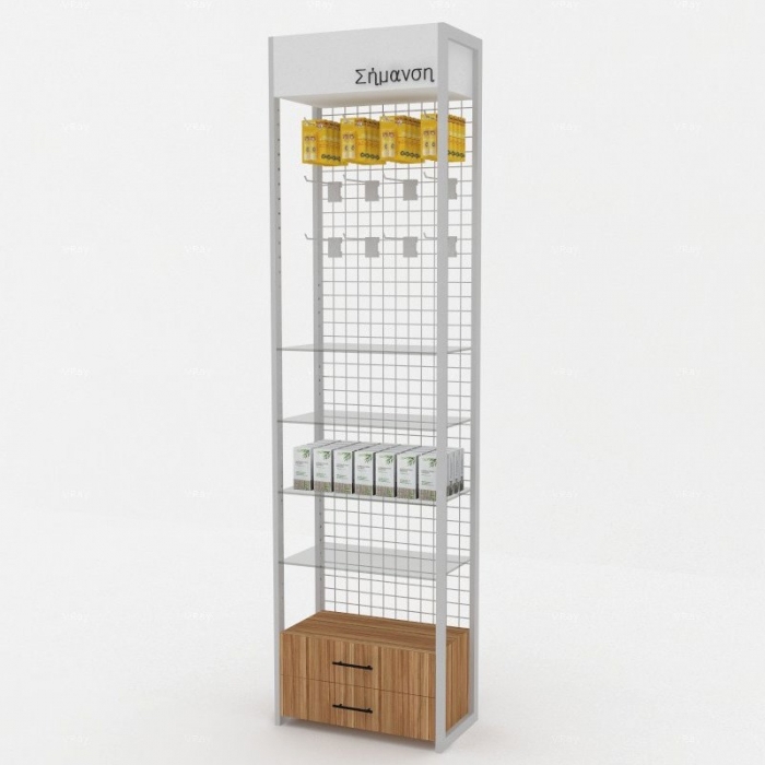 Έπιπλο για τον τοίχο του Φαρμακείου, με μεταλλικό πλέγμα στο οποίο προσαρμόζονται γάντζοι κρέμασης προϊόντων. Στο μεταλλικό σκελετό του επίπλου στηρίζονται ράφια.