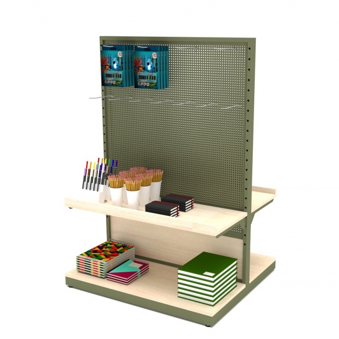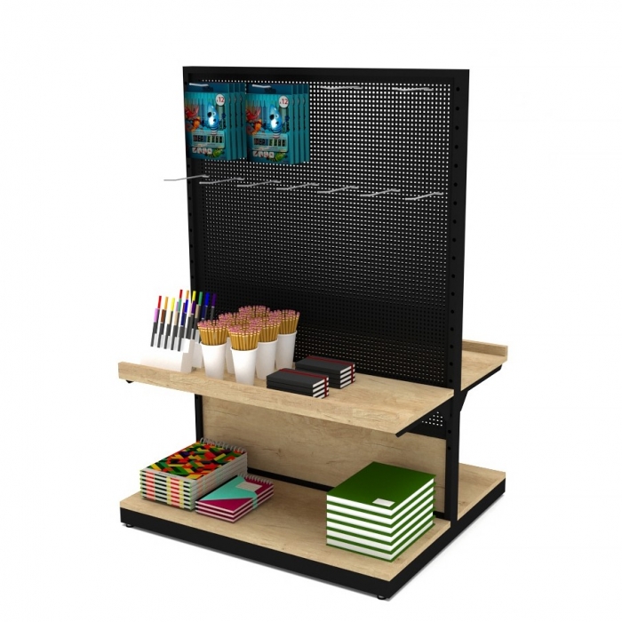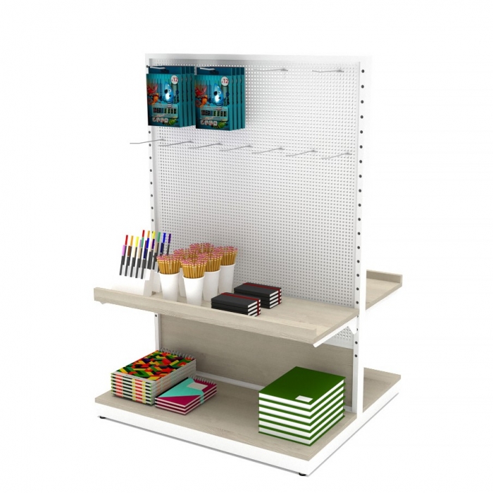 Stand για προβολή προϊόντων σε δύο (2) πλευρές. Διαθέτει δύο (2) ράφια από μελαμίνη και διάτρητη λαμαρίνα για κρέμαση σε γάντζο.