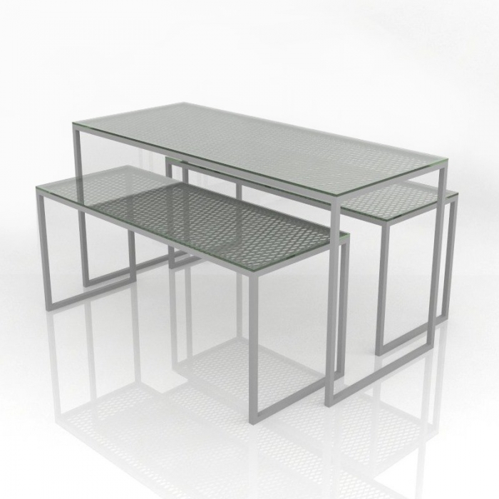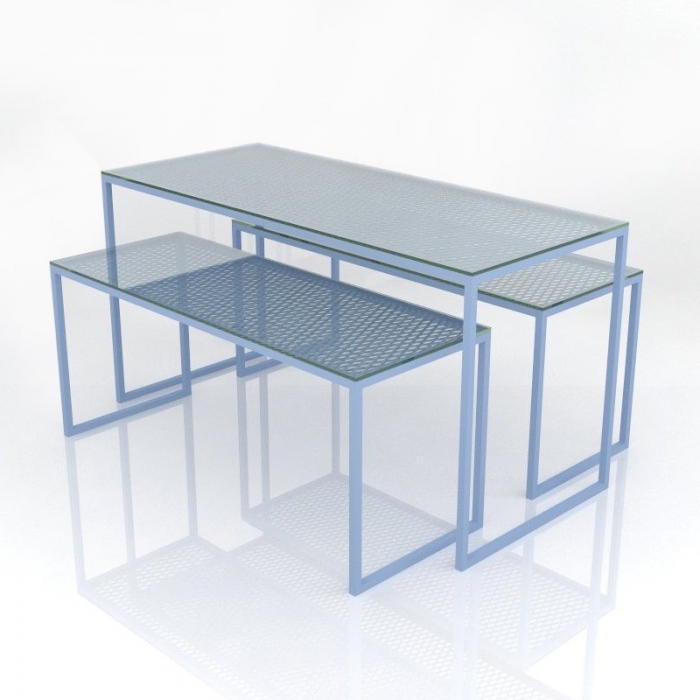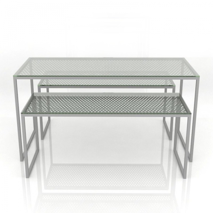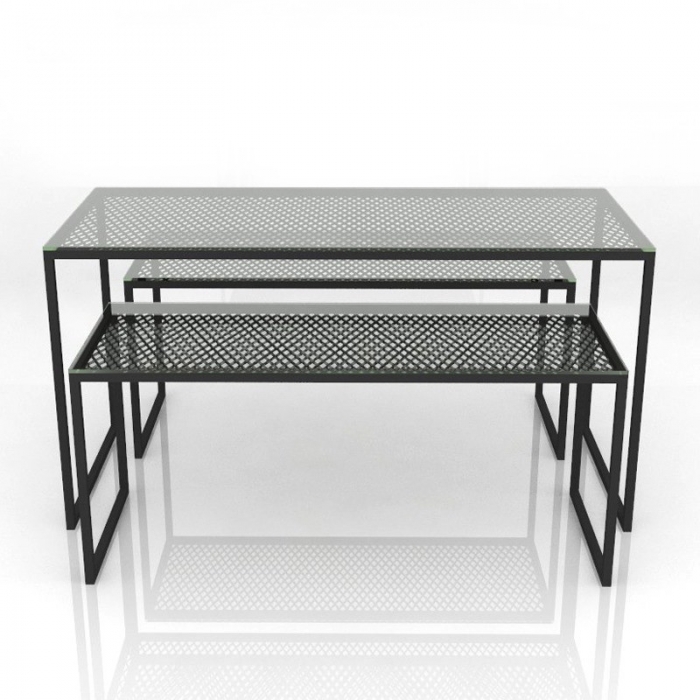 Τραπέζια (σετ) έκθεσης προϊόντων κατασκευασμένα από στραντζαριστά σίδερα και μεταλλικό πλέγμα. Διαθέτει γυάλινες επιφάνειες προβολής.