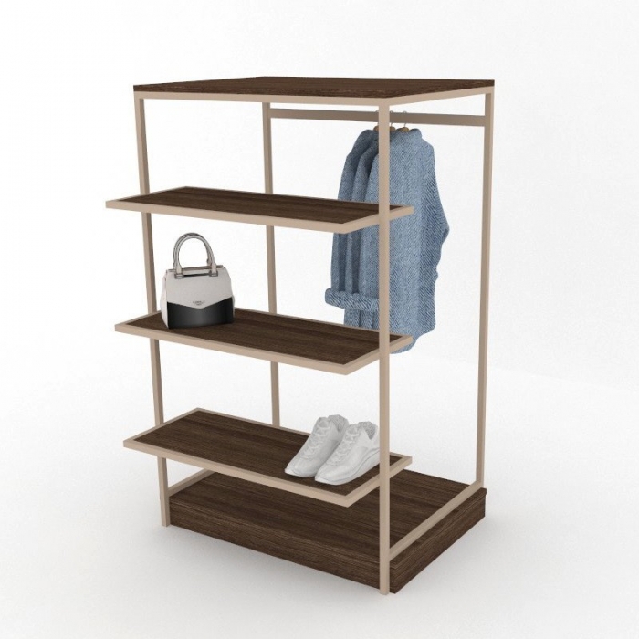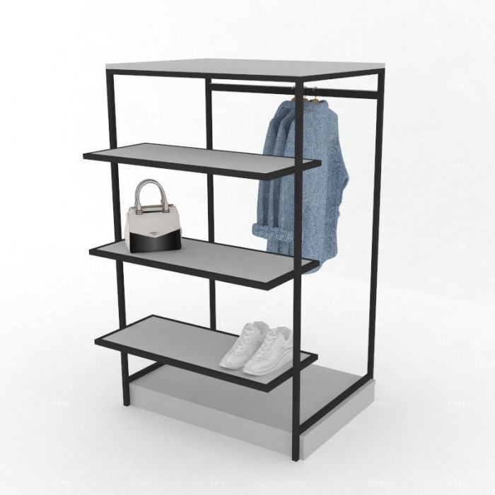 Στο εσωτερικό του επίπλου περιλαμβάνονται, στη μία πλευρά μπάρα κρέμασης από στρατζαριστό σίδερο με διατομή 30 Χ 15 mm σε ύψος 130cm ενώ στην δεύτερη πλευρά περιλαμβάνονται τρία (3) σταθερά ράφια κατασκευασμένα από μελαμίνη και περιμετρικά με στρατζαριστό σίδερο. Διάσταση: Μ 90 Χ Π 35cm. To έπιπλο είναι κατάλληλο για προβολή ενδυμάτων και αξεσουάρ μόδας σε κρέμαση και διπλωμένα.