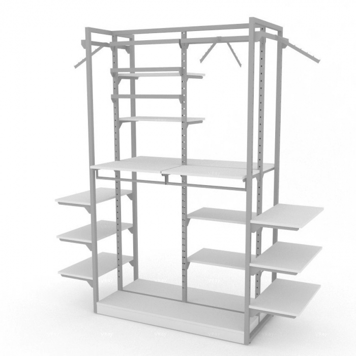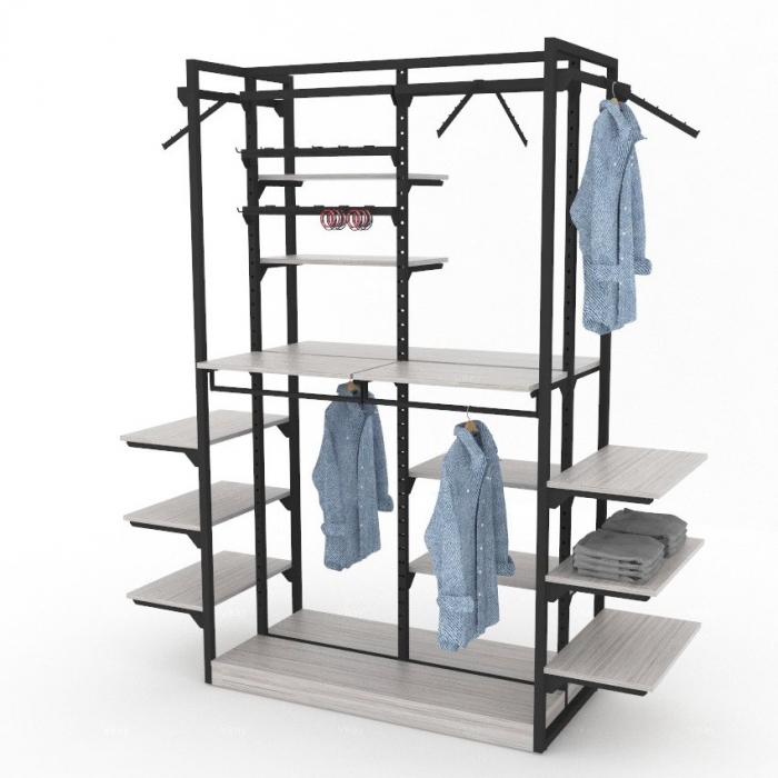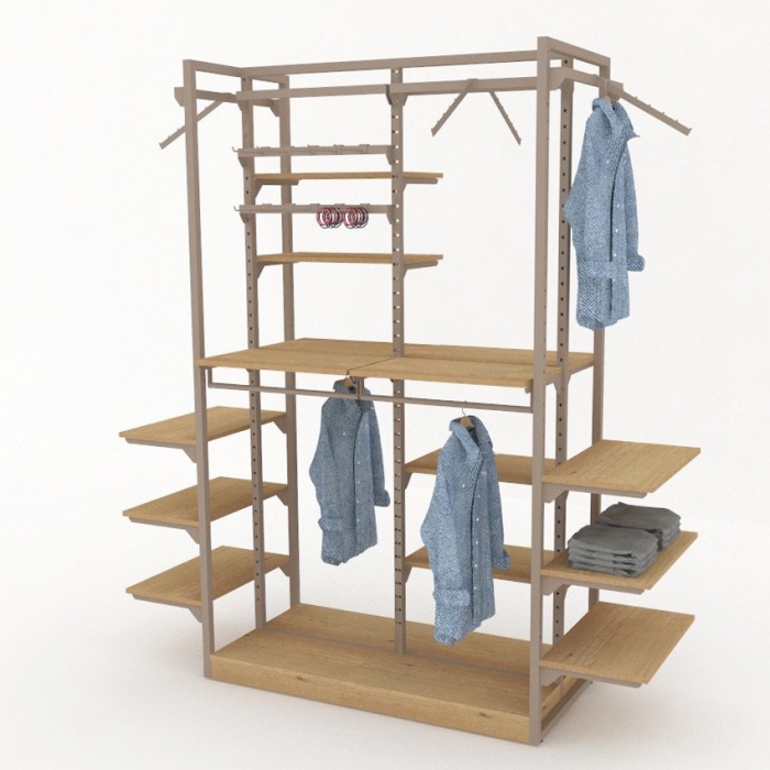 Ψηλό Stand Μεσαίου Χώρου για κρέμαση ρούχων αλλά και προβολή αξεσουάρ σε ράφια. Όλα τα εξαρτήματα ρυθμίζονται ελεύθερα στο διάτρητο μεταλλικό σκελετό του stand.