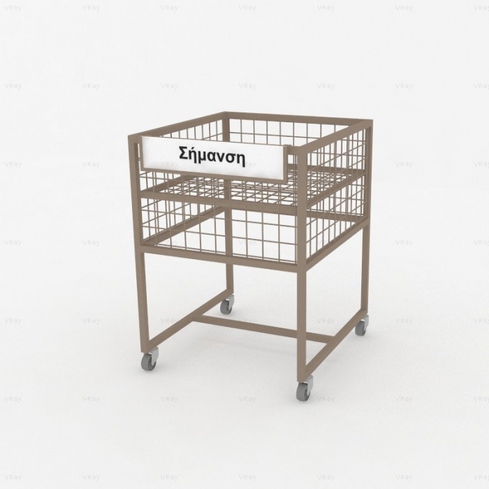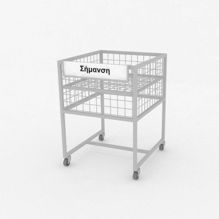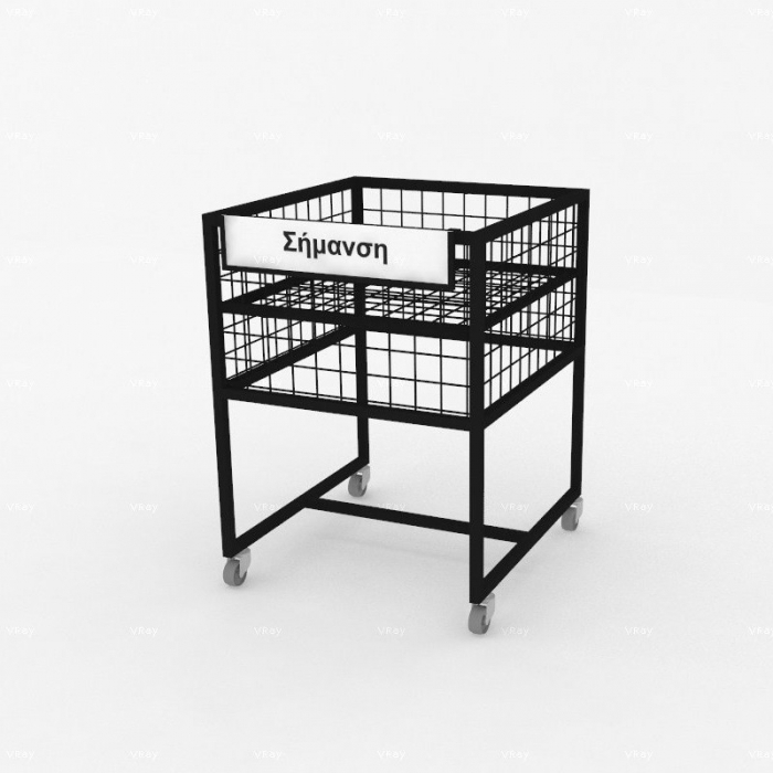 Καλάθι προσφορών για το κέντρο του φαρμακείου. Διαθέτει ρόδες, σκελετό από στραντζαριστό σίδερο και επιφάνειες από συρμάτινο πλέγμα 5x5cm.
