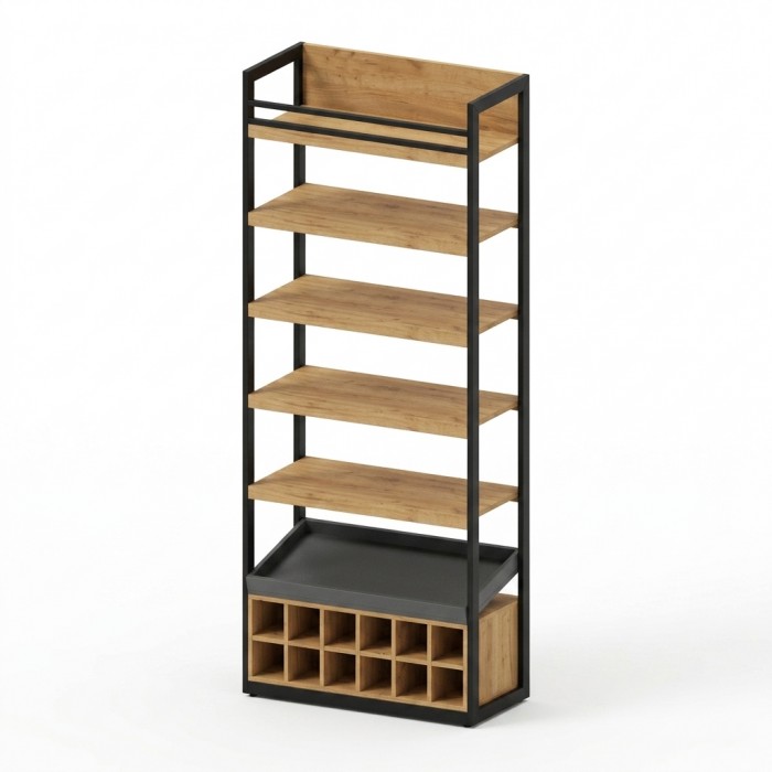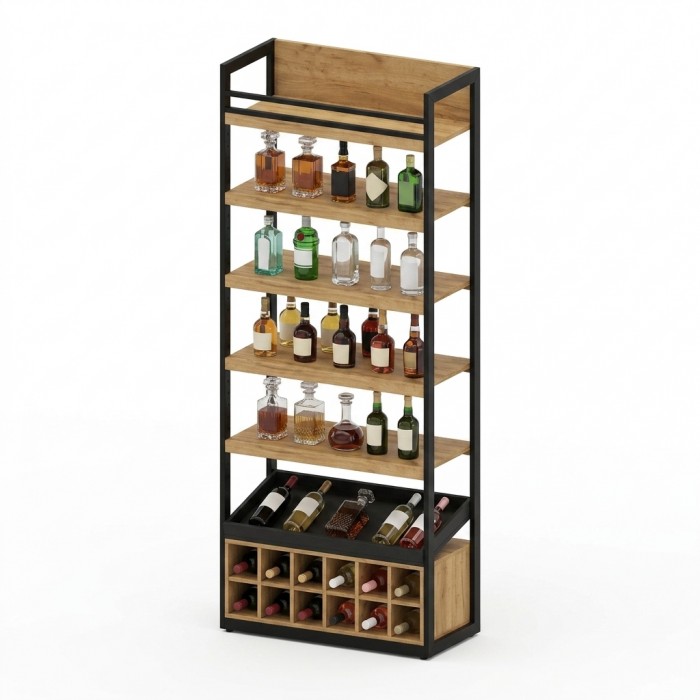 Αυτοστήρικτο έπιπλο για ποτά και κρασιά με δυνατότητα προβολής των μπουκαλιών με τρείς διαφορετικούς τρόπους και χώρο προβολής - δημιουργίας θέματος διακόσμησης στο άνω μέρος (ράφι κορυφής)