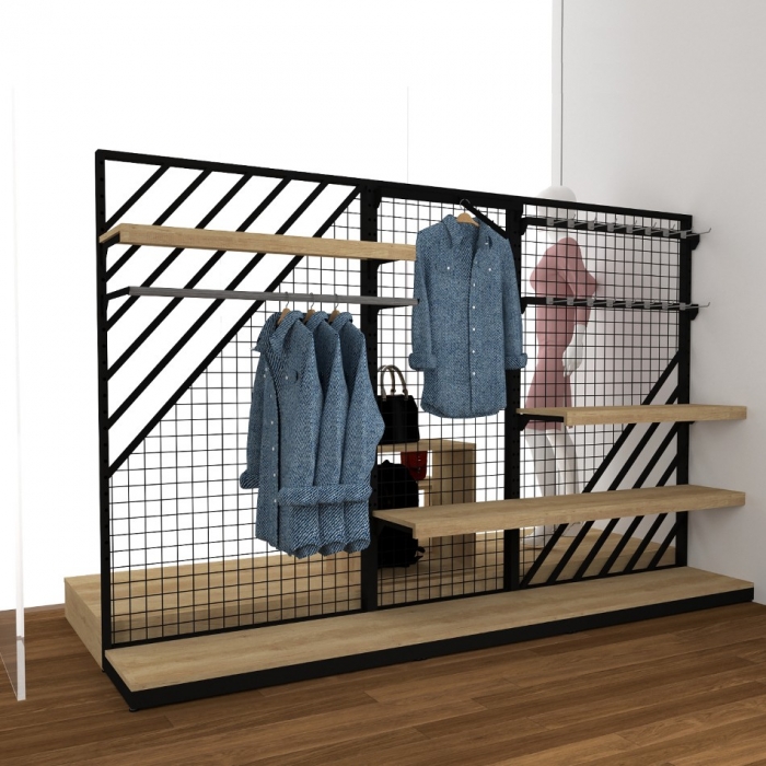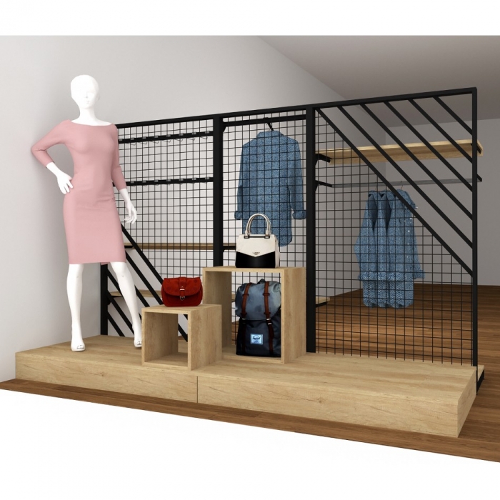 Σύνθεση επίπλων για την προβολή προϊόντων σε βιτρίνα καταστήματος μόδας. Διαχωριστικές πλάτες με δυνατότητα κρέμασης προς τον εσωτερικό χώρο του μαγαζιού.