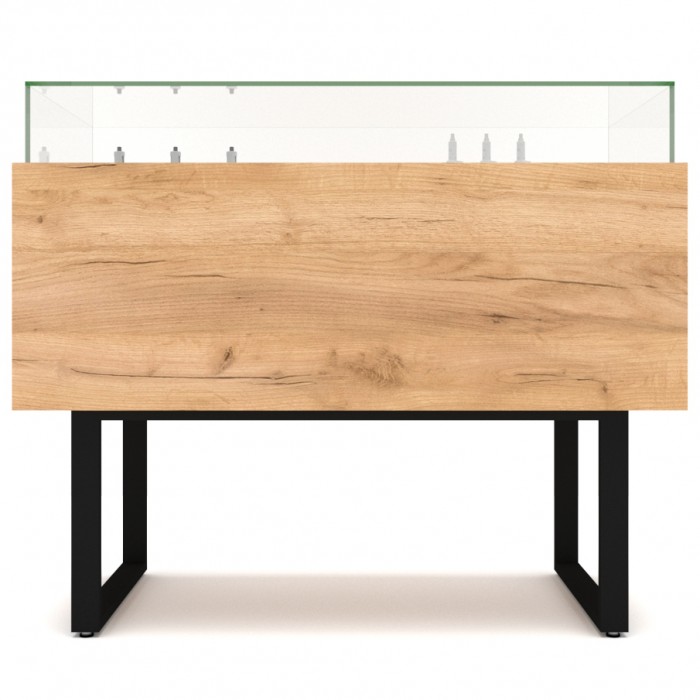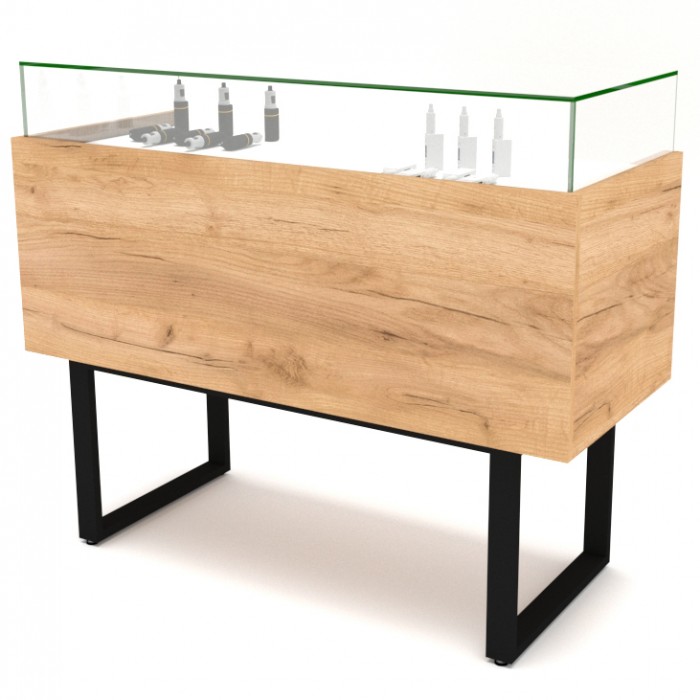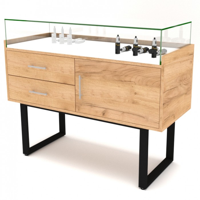 Πάγκος - βιτρίνα για την προβολή προϊόντων και εξυπηρέτηση πελάτη. Εσωτερικά διαθέτει δύο συρτάρια και ντουλάπι. Μεταλλική βάση από ενισχυμένο σίδερο.