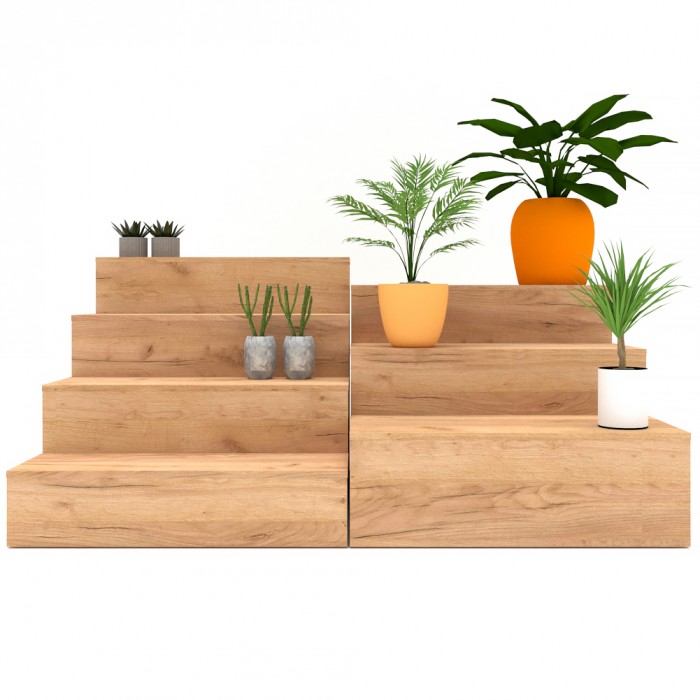 Σύνθεση ξύλινων βάθρων για την προβολή λουλουδιών και φυτών στον εσωτερικό χώρο του ανθοπωλείου ή φυτωρίου.