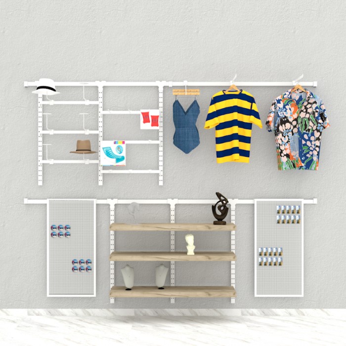 Ένας συνδυασμός της ράγας ORION με κάθετους ορθοστάτες ORION και ποικιλία εξαρτημάτων προβολής προϊόντων.