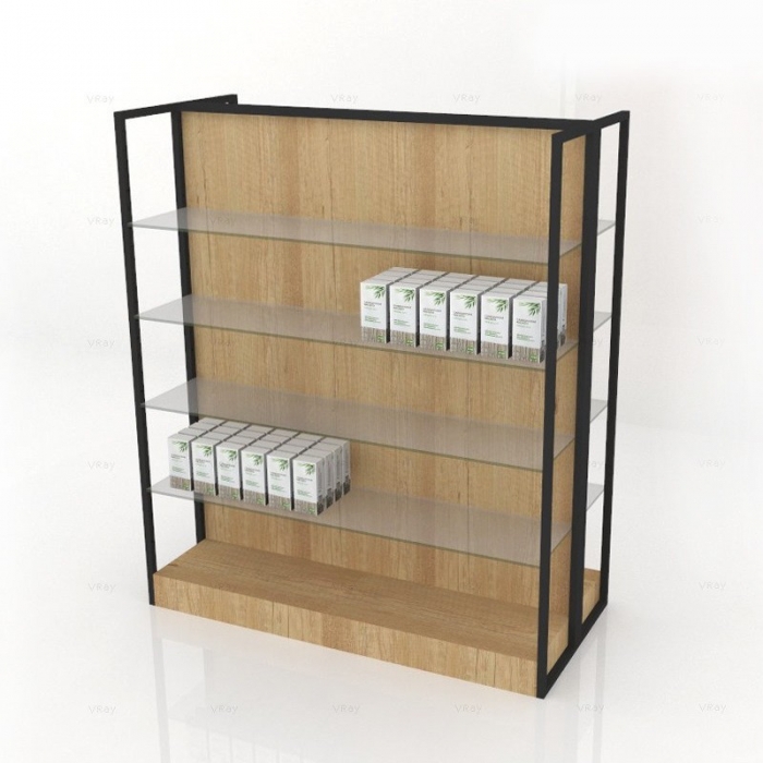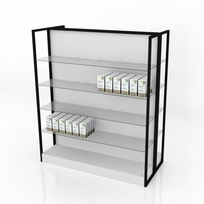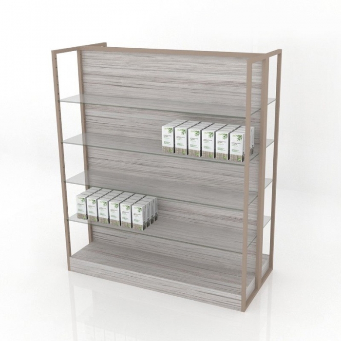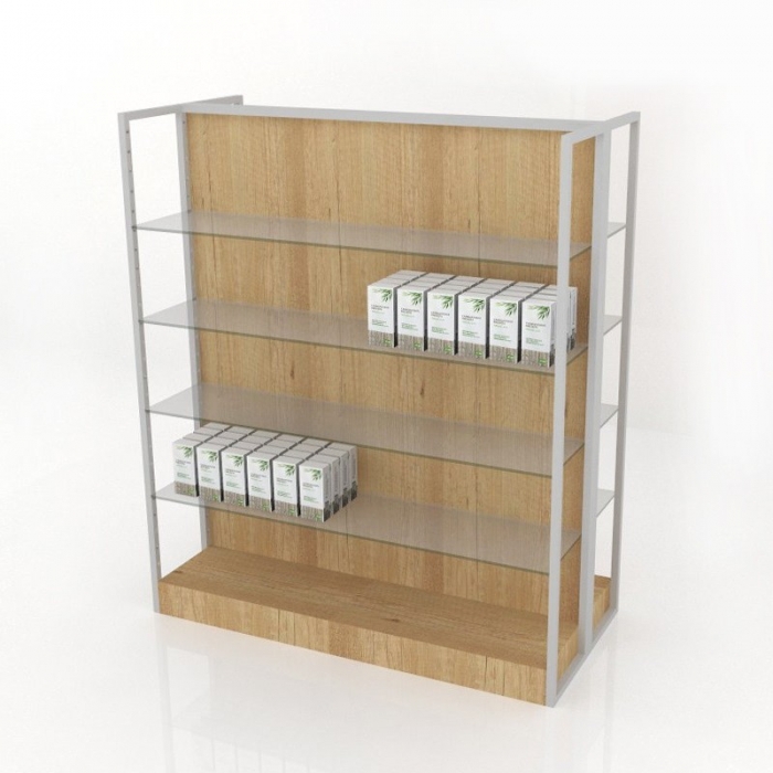 Γόνδολα δύο όψεων, ιδανική για το Φαρμακείο, το Κατάστημα Καλλυντικών και όχι μόνο! Διαθέτει 4 ράφια κρύσταλλο που στηρίζονται σε μεταλλικό σκελετό σε κάθε πλευρά και βάθρο μελαμίνης στο κάτω μέρος.