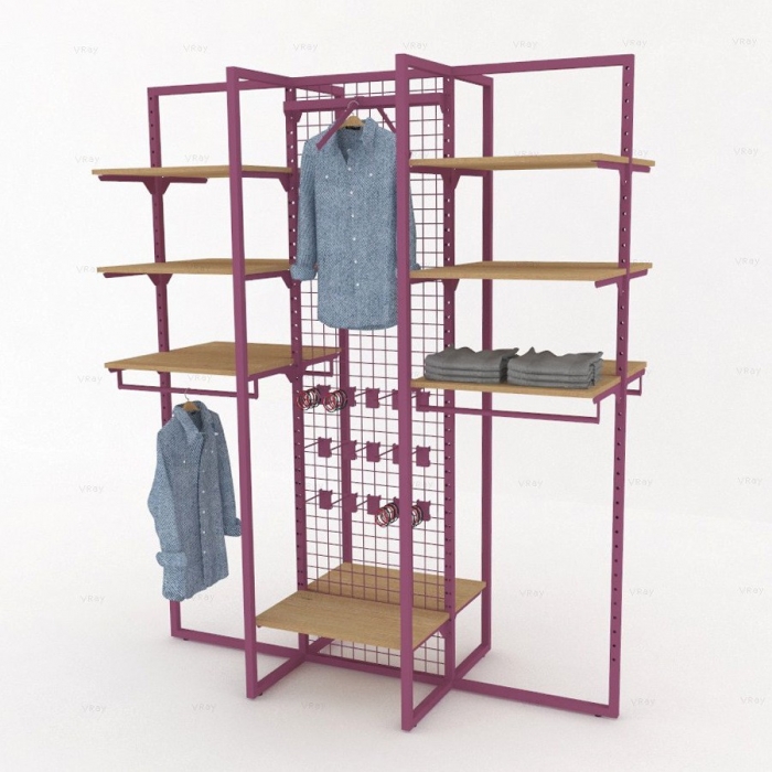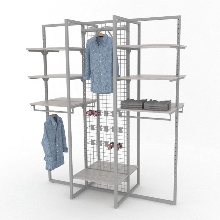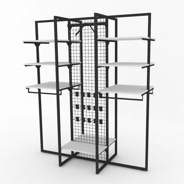 Σύνθεση για τον κεντρικό χώρο του καταστήματος μόδας με μεγάλη ευελιξία και λειτουργικότητα, καθώς περιλαμβάνει ράφια, οριζόντιες και κεκλιμένες μπάρες κρέμασης και πλέγμα για την ανάρτηση επιπλέον εξαρτημάτων.