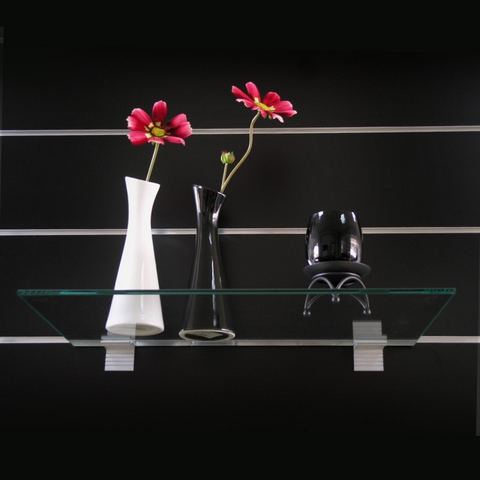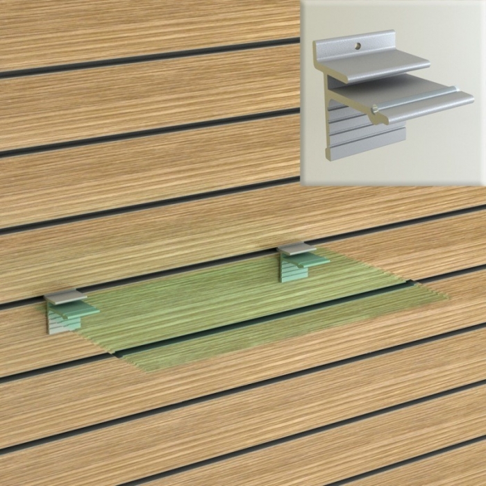 Στήριγμα Ραφιού για ράφι Κρύσταλλο σε Πάνελ του Συστήματος SLAT. Κατασκευάζεται από αλουμίνιο και διαθέτει λάστιχο σταθεροποίησης του τζαμιού.