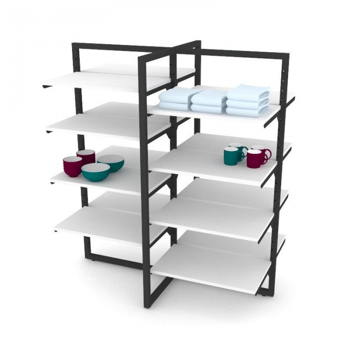 Stand καταστήματος με Διάτρητη Λαμαρίνα και τέσσερα (4) ρυθμιζόμενα ράφια μελαμίνης σε κάθε πλευρά.