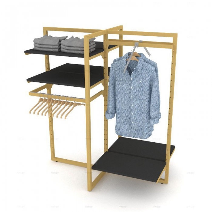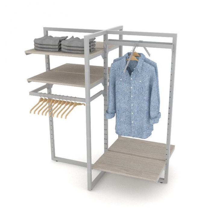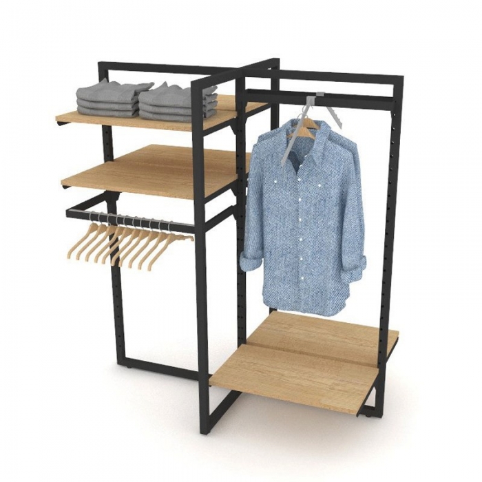 Πολυχρηστικό μεταλλικό stand κρέμασης ρούχων και στήριξης ραφιών σε τέσσερεις πλευρές.