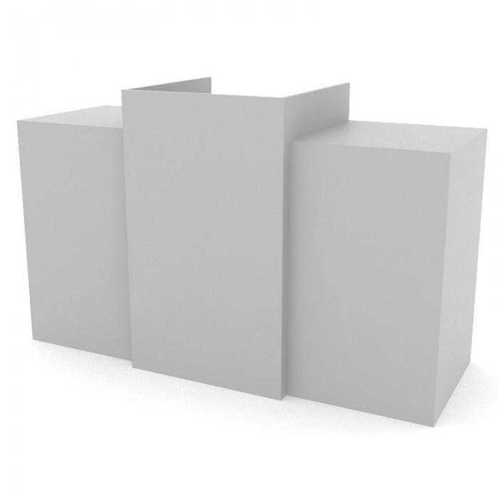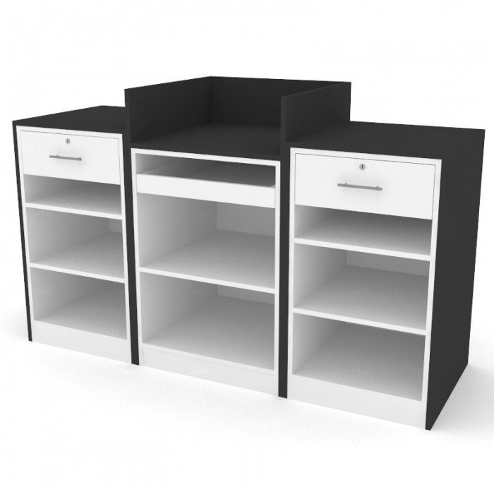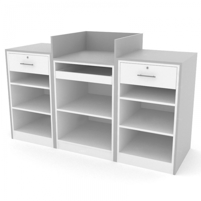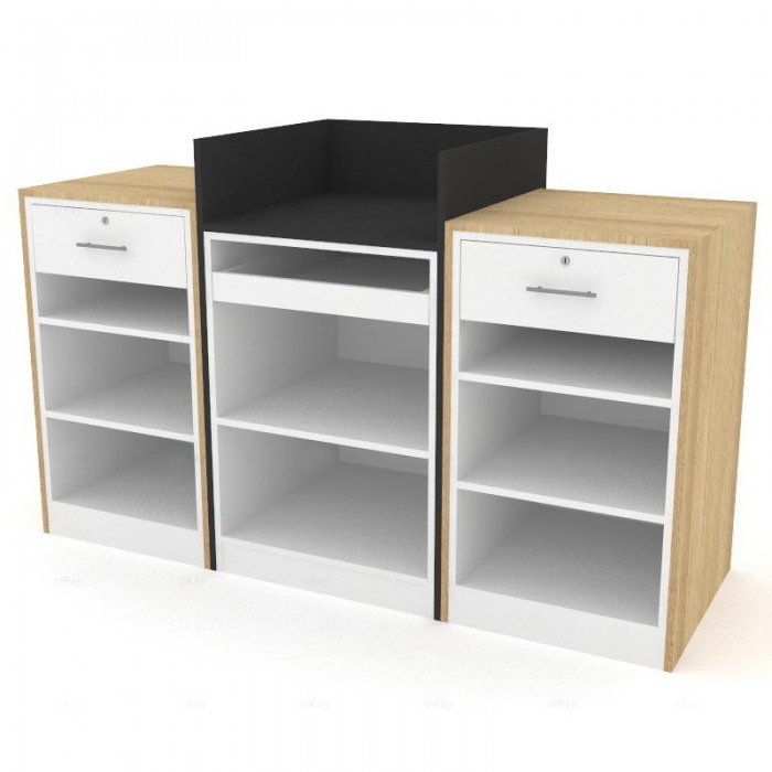 Σύνθεση ταμείου για εμπορικό κατάστημα, με θέση εργασίας και δύο βοηθητικούς πάγκους εξυπηρέτησης που διαθέτουν ράφια και συρτάρια.