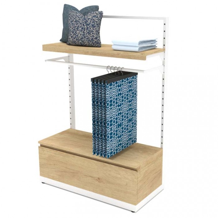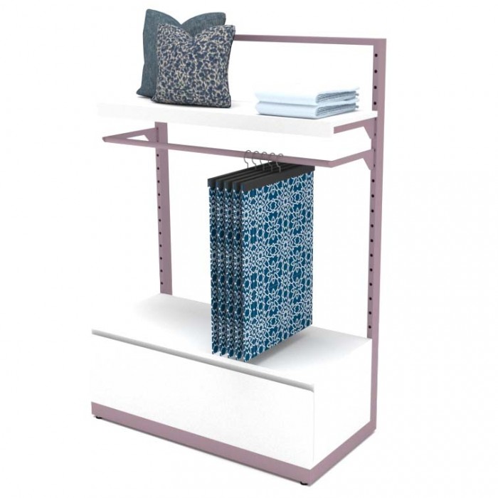 Αυτοστήρικτο έπιπλο μίας όψης με κρέμαση και ράφι για την προβολή κεντημάτων. Με διάτρηση ανά 5cm για ρύθμιση εξαρτημάτων και συρτάρι μελαμίνης στο κάτω μέρος.